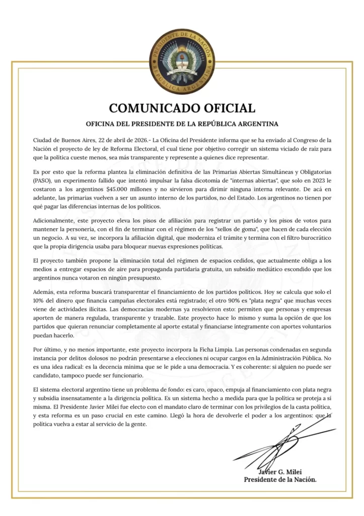 La iniciativa, titulada “Reforma Electoral Integral”, plantea un rediseño del esquema electoral argentino. Uno de los cambios más relevantes es la derogación de las primarias abiertas, simultáneas y obligatorias (PASO), lo que implica que cada fuerza política definirá sus candidaturas según sus propios mecanismos internos.