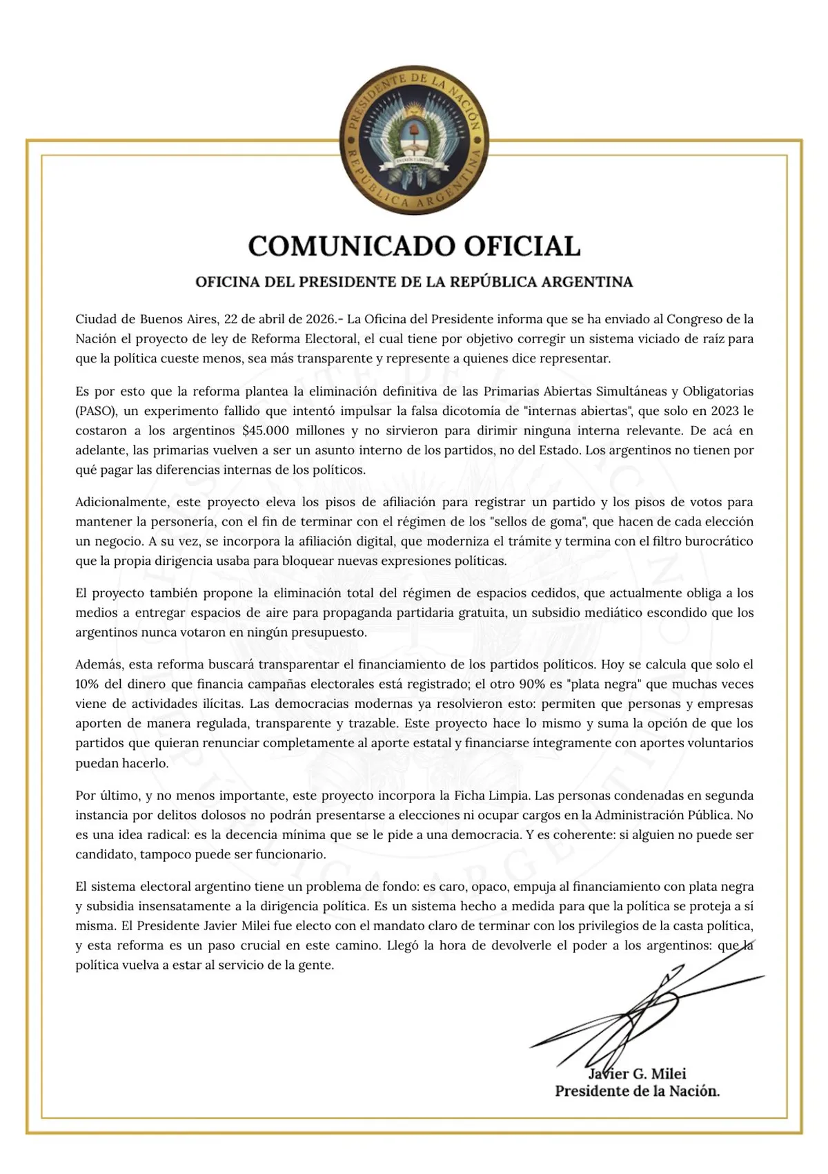 El Gobierno envió al Congreso un proyecto de reforma electoral que propone eliminar las PASO, incorporar Ficha Limpia para candidatos y modificar de manera integral el funcionamiento de los partidos políticos, el sistema de votación y el financiamiento de la política. La Oficina del Presidente señaló que la reforma «tiene por objetivo corregir un sistema viciado de raíz para que la política cueste menos, sea más transparente y represente a quienes dice representar».
